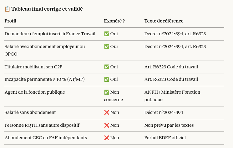 4. Les personnes bénéficiant d’un abondement pour incapacité permanente suite à accident du travail Les personnes utilisant un abondement accordé en raison d’une incapacité permanente d’au moins 10 %, consécutive à un accident du travail ou à une maladie professionnelle sont exonérées. 📌 Source : Art. R6323 Code du travail — confirmé par Skillandyou, CPFormation