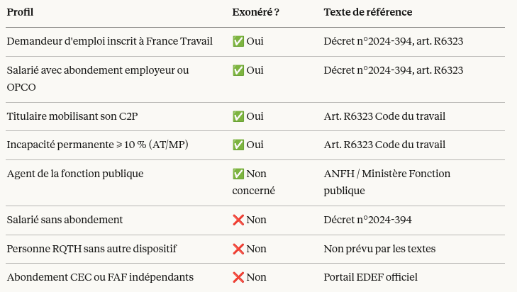 4. Les personnes bénéficiant d’un abondement pour incapacité permanente suite à accident du travail Les personnes utilisant un abondement accordé en raison d’une incapacité permanente d’au moins 10 %, consécutive à un accident du travail ou à une maladie professionnelle sont exonérées. 📌 Source : Art. R6323 Code du travail — confirmé par Skillandyou, CPFormation